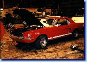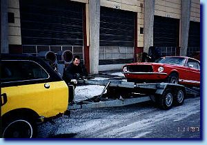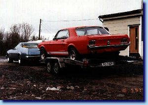 Nobody knew that it was a Shelby at that time, because it was converted once to a 'normal' Mustang to promote sales of Ford products rather than Shelbys. When I checked it out there was still a tach mounted to the column plus.... Well, I stuck a deal after some time with the last owner after some negotiation. My friend Arild Guldbrandsen and me went with his Camino and a trailer to the garage and picked the car up. The pictures to the left show the car in the condition when we loaded it up. Have a look at the smile of my friend Arilds face. I restored the car and used it as a daily driver for some years in the early 90ies. It was then that more and more vintage race pictures appeared in the magazines. In one of them I saw my car being mentioned as a Shelby. I send a letter to the SAAC and I got confirmation that my car was indeed one of the 26 Shelby Trans Am Hardtops. |