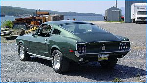 Another BULLITT from the COOL ZONE Wade Jardine from Ketchikan owned this dark highland green /DHG) early 68. Although not a plain dull BULLITT replica in the McQueen sense, the chrome pieces don't distract from its personal value for COOL fan Wade and the cars new owners in St. Barbara. " The car was believed to be an original GT J code car. I rebuilt most every thing and indeed it was difficult. The engine was a 302 high nickel race block with ported 302 heads and matched intake, Edelbrock carb, and lots of billett aluminum. The trans is a C4 with shift kit hooked up to a 9 inch rear end. It has the HiPo exhaust manifols hooked up to 2 1/2 inch dual exhaust. I loved the movie and bought the DVD when it became available. I am amazed at the new interest in the Bullitt mustang that has taken place. It was great to see the clone in Sheryl Crows video or the 1967 in Vanilla Sky with Tom Cruise.I am excited to see Fords new version of their retro fastback" says Wade and I guess he means it in DHG.