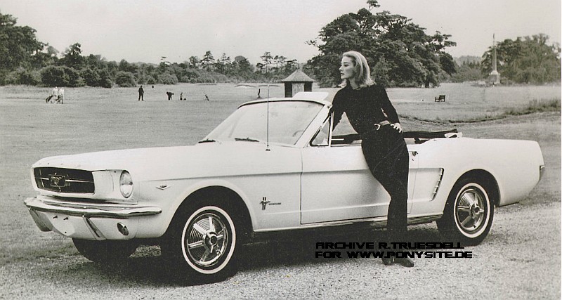 ![]() The early 1964 white Mustang convertible appeared already during the Golf scene filming near the Pinewood Studios in May 1964 Note the white convertible soft top underneath the otherwise visible red top cover and the white sunvisors. Richard Truesdells article appeared in 2019. Picture with permission from him appear here. | |