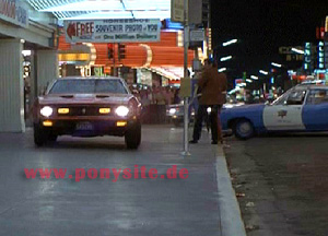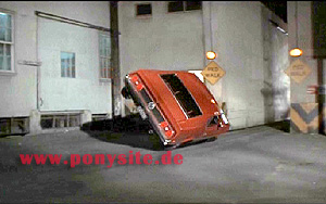 ![]() Mike reported as of 2000: "At least 4 of the 302s were put on their roofs by an unskilled stunt driver during the 2-wheel-alley stunt. The stunt filming took place over some months due to unprofessional work performed the first time, when the original selected stunt team was not available. Finally Carey Loftin (the same stunt director as for BULLITT) decided to get the 2 wheel stunt done. I talked to Carey Loftin back in '92-' 93 and he drove my Mach for some of the harder stunts but the man who did the alley stunt with another Mach 1 was "Buzz Bundy" who was at the time doing a rolling car stunt show with all Ford cars called "Tournament of Thrills". They already used in 1970 a white Mustang. After Everett Creach, the stunt driver had rolled several of the 302 Machs on their roofs damaging them beyond repair, they called in Buzz to do the stunt. He is to have credit for this stunt. No one else could do this or set the car up correctly. It became visible when later on another stunt team performed the trick with the other side of the car up, they were simply not able to do it on the same side as Buzz did." "My Hero car was principally driven by a look a like stunt driver of Sean Connery name of Dick Butler who was directed by Guy Hamilton and Paul Baxley. I spoke to both directors and Butler during my research and they advised that the Mustang they needed to do all of the LV downtown high speed and high torque stuff had to have the biggest engine Ford could put in the Mustang body style at that time. When I talked to Paul Baxley, the film stunt coordinator/director, he advised me that they needed a Mustang with a much more powerful engine in it to do the back-up, 180 degree hard-brake-spin around which is right in the beginning of the chase scene as the sheriff approaches the Mach 1. Enter the 429CJ. My car was used for all the downtown driving. The only other two cars used and seen in the film were the alley car I have mentioned earlier and one of the wrecked-roofed 302's. This wrecked 302 Mach was only used to go up and over the car carrier truck in the parking lot chase scene. After that, the 302 was crushed because it was damaged beyond repair. That was it. During the repeated trials and various camera settings during the period and two different stunt teams performing the stunt in the LA Universal studios and in Las Vegas later, something was overlooked. In the film scenes used later, the car went into the narrow pedestrian gap between the houses on the right hand wheels (in the studios) and came out the other side (in Las Vegas) driving on the left hand wheels. A mistake from the french stunt team that did the work in Las Vegas. If you watch again this scene, you will notice that a close-up sequence was put between those two takes, where the car actually flips from top to down." This scene was filmed while Sean Connery and Tiffany were in the studio and the car being fixed in a roller cage as was narrated later. |